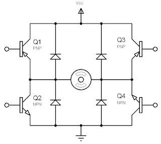 نستطيع بناء دائرة قنطرة اتش (H-bridge circuit) باستعمال أربعة ترانزستورات، حيث أننا سنستعمل كل ترانزستور كمفتاح أو قاطعة كهربائية، ليكون شكل الدائرة كالتالي:
